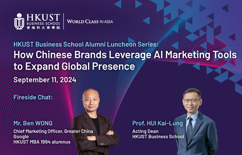 AI is revolutionizing the business world, creating fresh opportunities to expand into new markets and achieve unprecedented success. HKUST Business School is pleased to present an attention-grabbing topic “How Chinese Brands Leverage AI Marketing Tools to Expand Global Presence" on September 11, 2024 (Wednesday). Join us for an engaging luncheon where our distinguished MBA alumnus, Mr. Ben WONG, Chief Marketing Officer for Greater China at Google, will share the AI marketing tools for unlocking global growth and brand expansion. He will be in dialogue with Professor HUI Kai-Lung, Acting Dean of HKUST Business School, who will also provide updates on the latest developments of your alma mater.