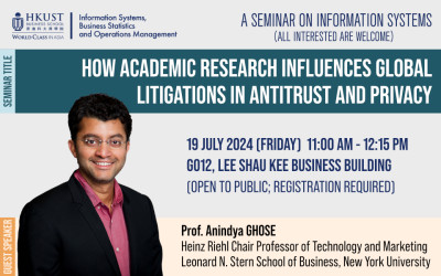 Seminar on Information Systems How Academic Research Influences Global Litigations in Antitrust and Privacy 19 Jul 2024 (Friday) 11:00am - 12:15pm G012, Lee Shau Kee Business Building Prof. Anindya Ghose Heinz Riehl Chair Professor of Technology and Marketing at New York University's Leonard N. Stern School of Business On Campus