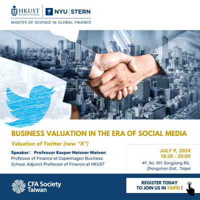 HKUST-NYU Stern MS in Global Finance program Finance Seminar in Taipei: Business Valuation in the Era of Social Media 09 Jul 2024 (Tuesday) 18:30-20:00 4F, No. 101, Songjiang Rd., Zhongshan Dist., Taipei Prof. Kasper Meisner Nielsen Professor of Finance at Copenhagen Business School & Adjunct Professor of Finance at HKUST Business School Off Campus