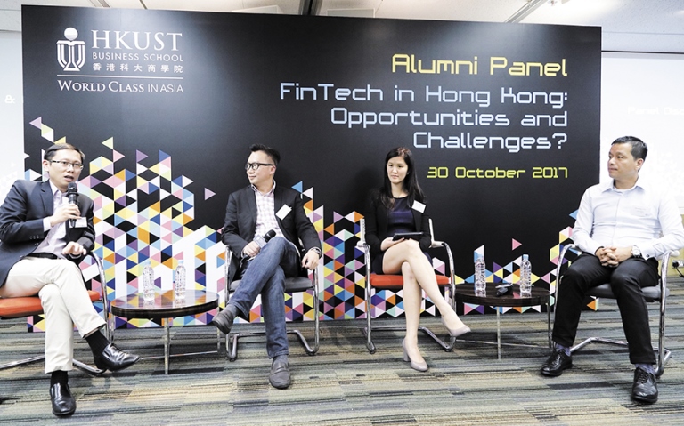 The week-long FinTech events began with a session at which alumni shared their insights and experiences regarding opportunities and challenges amid the rise of FinTech. Three entrepreneurs took part: Samson Lee (MBA/MSc), Co-founder of Ethereum South China and South Asia, a decentralized platform that runs smart contracts applications; Jonathan Lee (BBA in Finance), Co-founder of 300cubits, a blockchain initiative relieving the “pain points” within the container shipping industry; and Bianca Ho (BBA in Global Business), Co-founder of Clare.AI, an end-to-end digital assistant solution which focuses on real data from the financial industry.