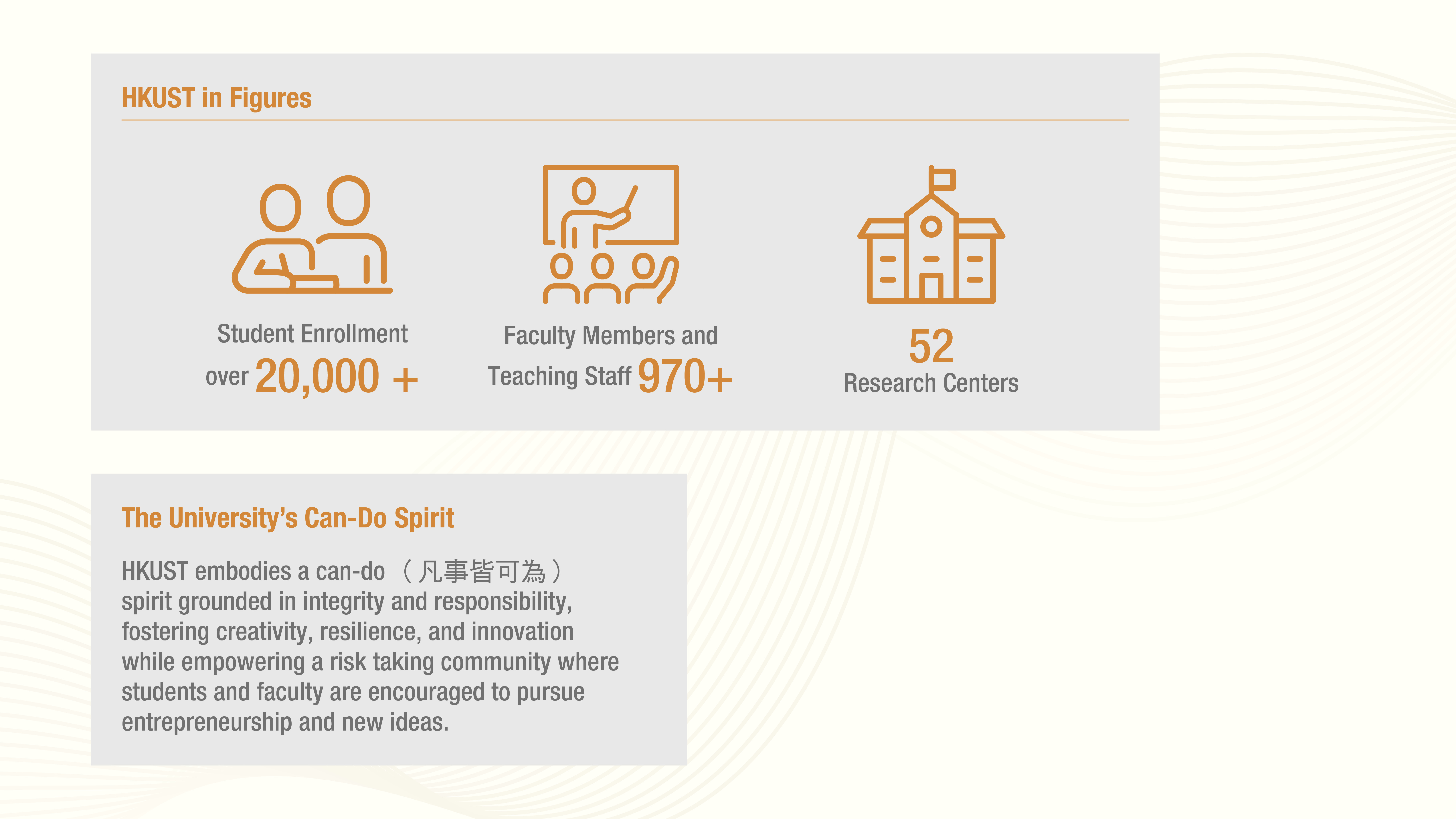 Going from one academic building and a few student hostels in 1991 to ranking among the world’s top 50 universities, HKUST’s story is one of belief, persistence, and community spirit. Over 100,000 graduates have now embarked on the next chapter of their lives, each taking with them the University’s enduring “can-do” spirit and will to succeed.