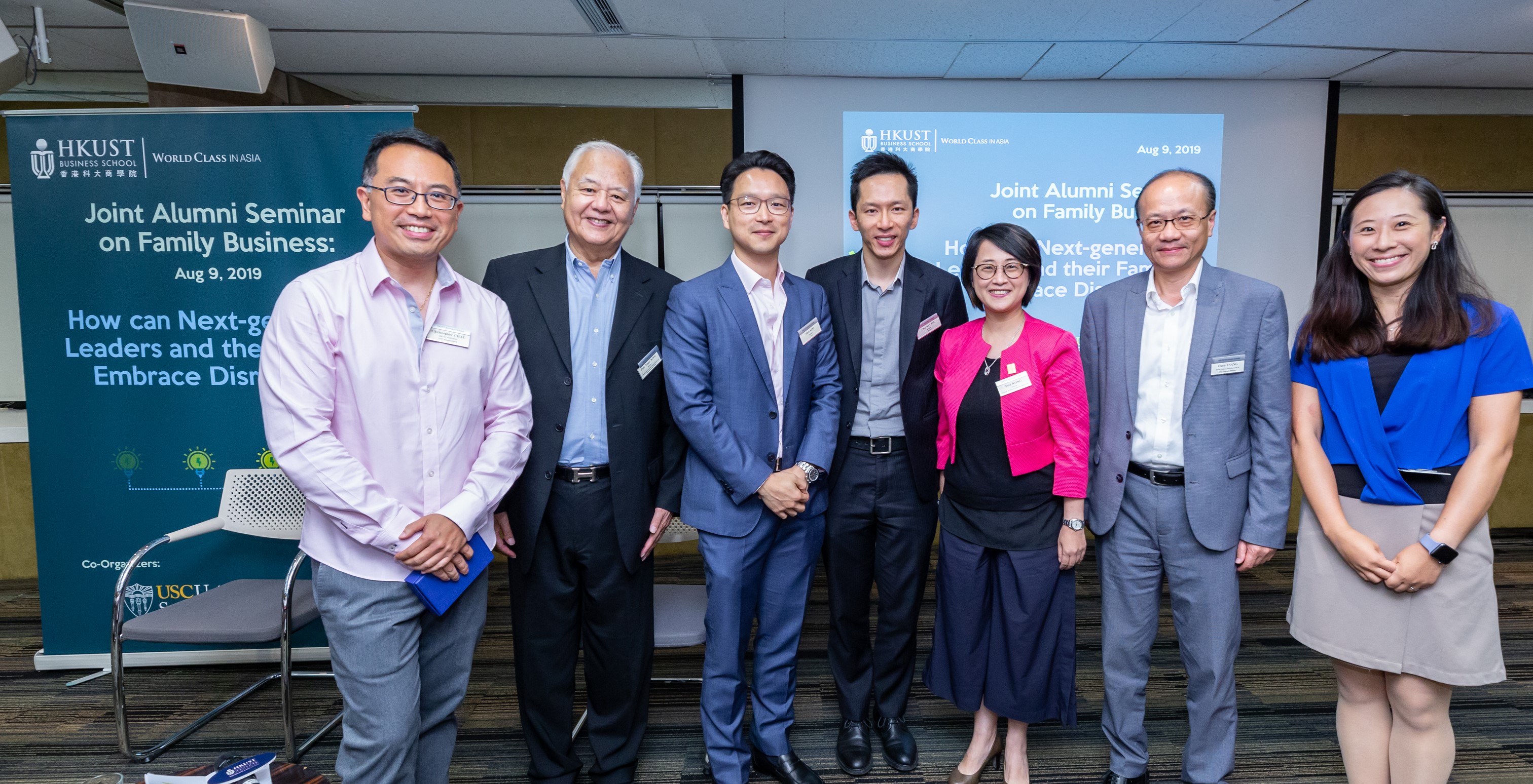 The seminar began with a presentation by our alumnus faculty and family business expert Prof Roger KING, Founding Director of the Tanoto Center for Asian Family Business and Entrepreneurship Studies. His talk was followed by a panel discussion with next-generation family business leaders from the three universities – Mr Charles LAW, Managing Director of Culture Technology Group (HKUST); Mr Alick KOO, Managing Director of UCP International (NYU); and Mr William SHUM, Founder and CEO of Memorigin Watch Company (USC). The panelists shared their unique ways of embracing disruptions while preserving their families’ wealth, harmony, value and legacy.