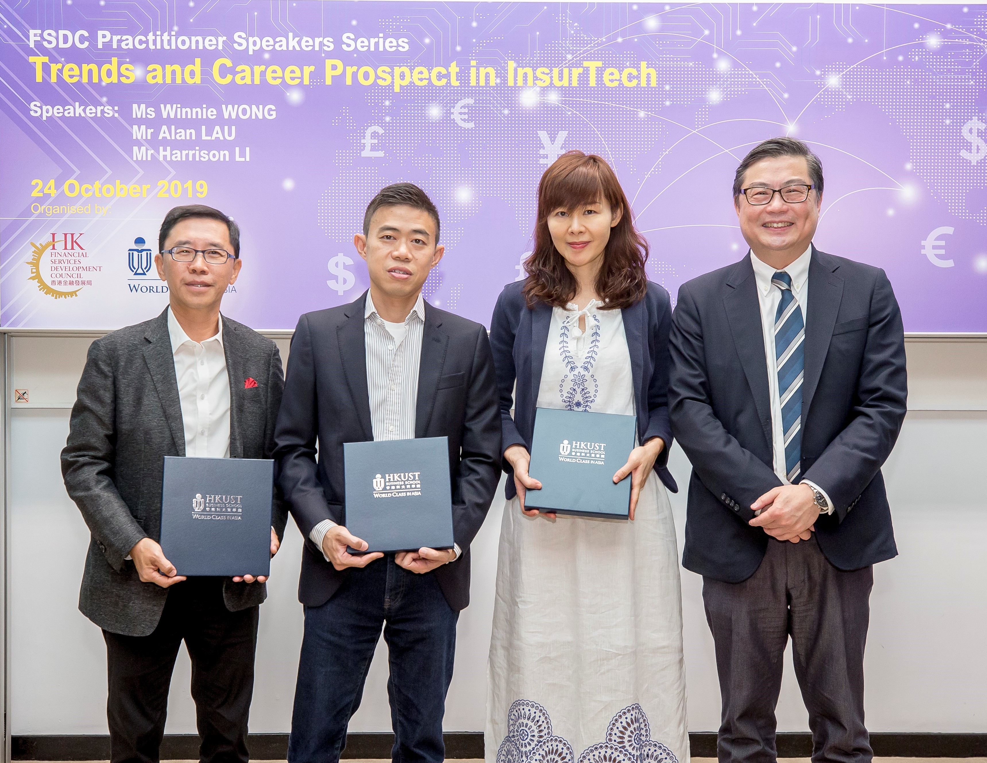 On October 24, the School welcomed three experts to talk about a growingly important topic – “Trends and Career Prospects in InsurTech.” They were Winnie WONG, CEO of the Asia Insurance Company Ltd; Alan LAU, Chairman and CEO of WeSure (Tencent’s internet insurance platform); and Harrison LI, Regional Director of FWD Life Insurance.