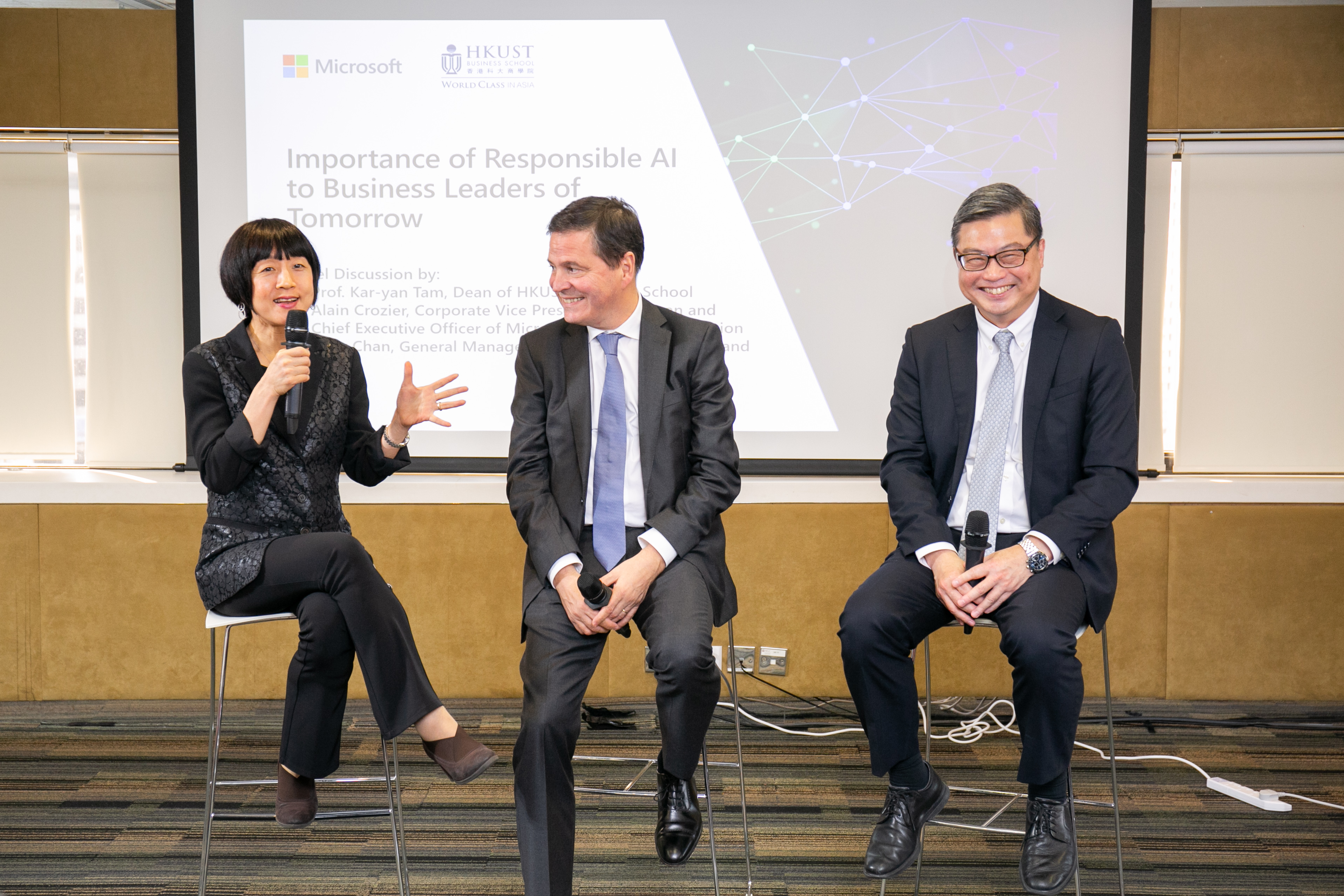 At the signing ceremony, held on November 1, an industry-academia panel including Alain CROZIER, Corporate Vice President, Chairman and CEO of Microsoft Greater China Region; Cally CHAN, General Manager of Microsoft Hong Kong and Macau; and Prof TAM Kar Yan, Dean of HKUST Business School discussed with journalists and practitioners on a topic - “Importance of Responsible AI to Business Leaders of Tomorrow”.