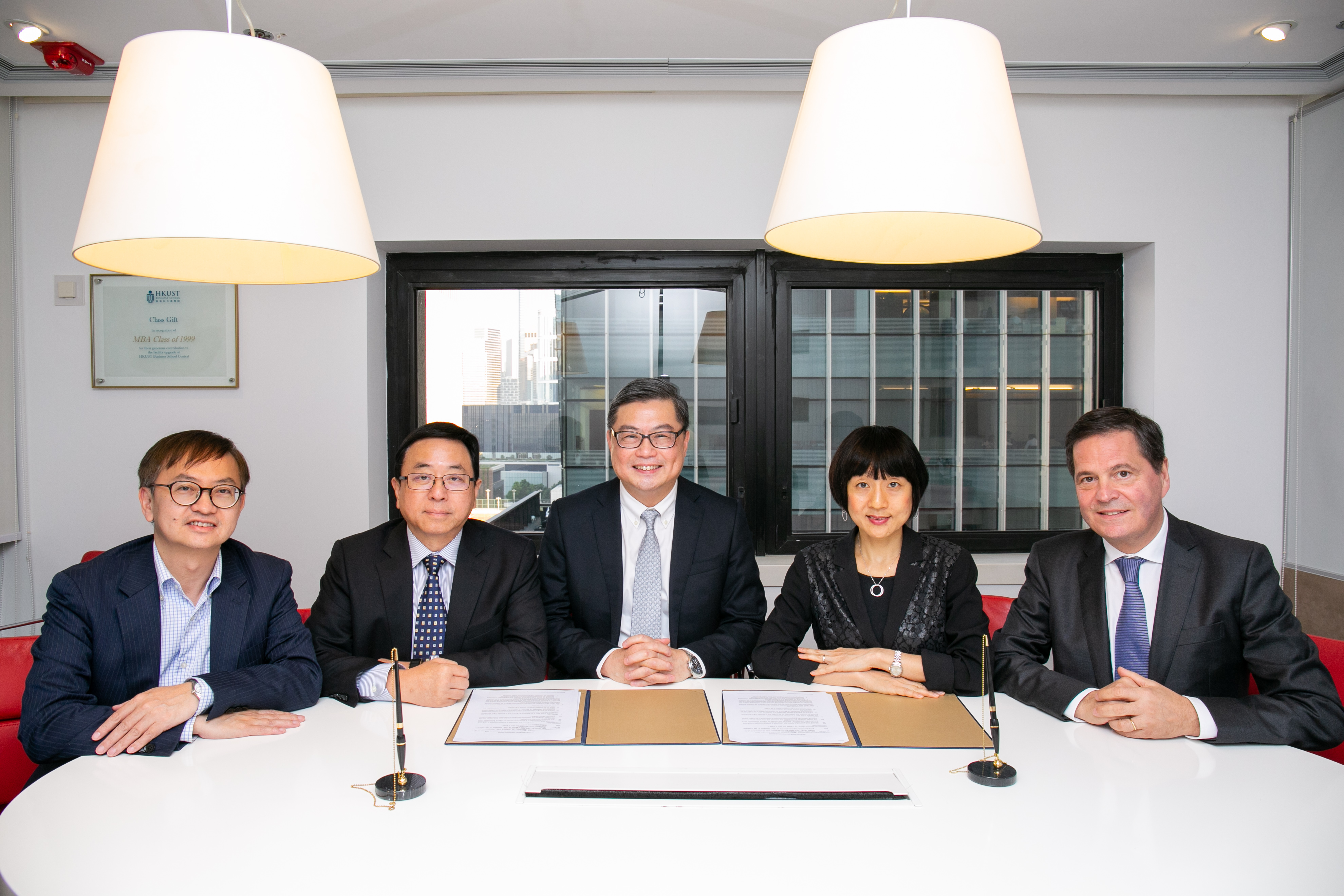 The signing ceremony includes (from left) Dr David CHUNG Wai-Keung, Under Secretary for Innovation and Technology; Prof Lionel NI, Provost of HKUST; Prof TAM Kar Yan, Dean of HKUST Business School; Ms Cally CHAN, General Manager, Microsoft Hong Kong and Macau; and Mr Alain CROZIER, Corporate Vice President, Chairman and CEO of Microsoft Greater China Region.