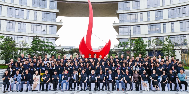 The HKUST EMBA alumni take a group photo with senior management of HKUST (GZ) and the HKUST Business School, with the icon of the new campus – the sundial sculpture.