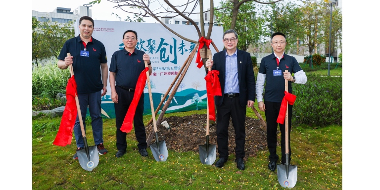 To commemorate the opening of the HKUST (Guangzhou) campus, the EMBA Alumni Association donated the very first red sandalwood tree, which is marked by a ceremony officiated by Prof. Lionel NI (second from left) and Prof. TAM Kar Yan (third from left) and two representatives from the Association.