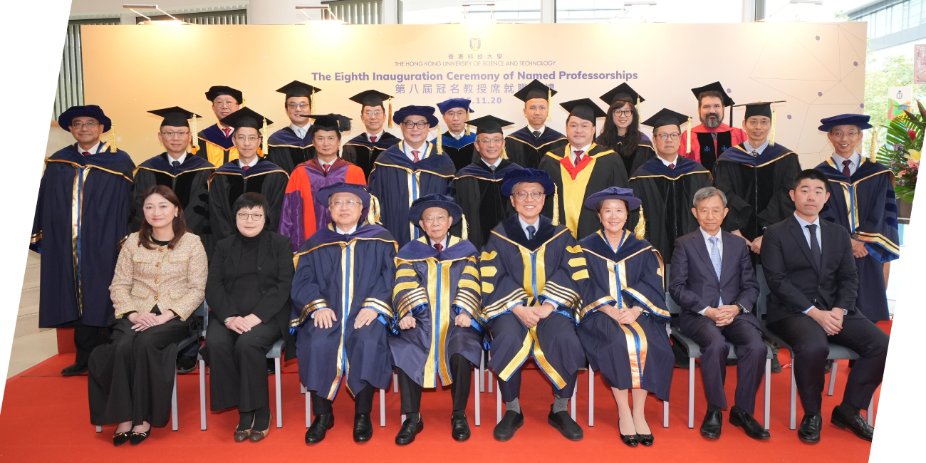 Group photo of HKUST Pro-Chancellor Dr. John CHAN Cho-Chak (first row, fourth left), Council Chairman Prof. Harry SHUM (first row, fourth right), Court Chairman Dr. the Honorable Andrew LIAO Cheung-Sing (first row, third left), and President Prof. Nancy IP (first row, third right), along with other senior management, Council and Court members, representatives of donors, as well as seven Named Professors.