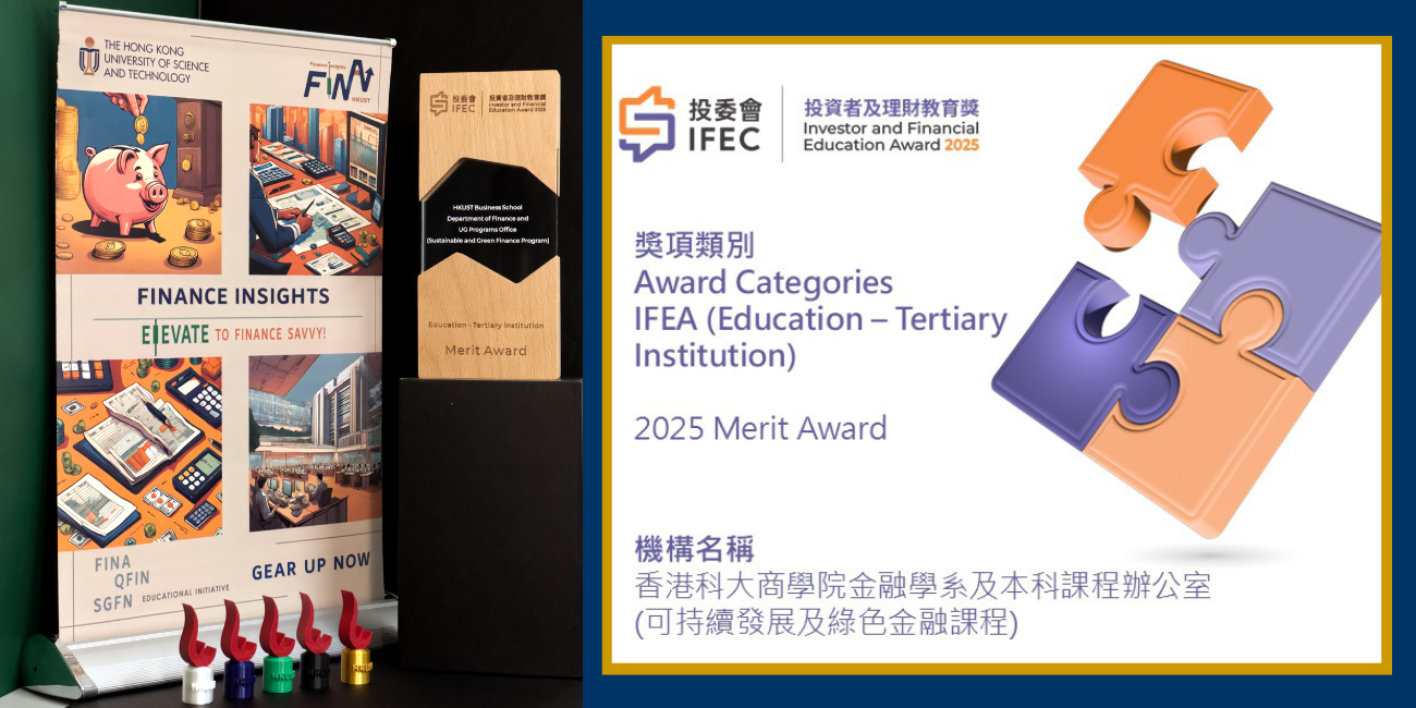 The HKUST Finance Insights program was awarded the Merit Award at the Investor and Financial Education Award 2025 (Education – Tertiary Institution Category). The award presentation ceremony was held on March 10, in the presence of Mr. Vitor DAWES, IFEC Chairman, and Dr. Jeff SZE, Under Secretary for Education, Education Bureau.