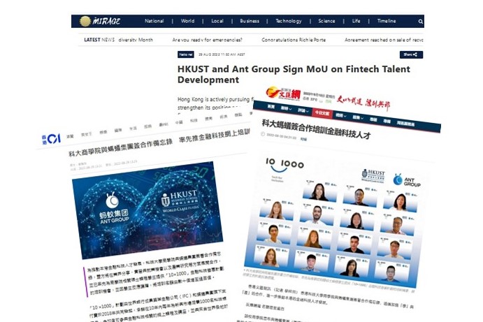 Various media including , HK Economic Journal, HK01 Finance, HK01 Education, Ming Pao Finance, HK Economic Times, hkcd.com, HKTKWW, DOT, WenWeiPo, HK Economic Journal, EJFQ, Fortune Insight, Line Today, First World Sec, JRJ, Sina, 163.com, Man Loong reported that the HKUST Business school and Ant Group have signed an MoU on collaborations covering industry insight sharing, internship and employment opportunities, as well as joint efforts on industrial research. As the first initiative under this partnership, selected master’s degree students of the School have already commenced fintech training under Ant Group’s fintech training program “10x1000 Tech for Inclusion”