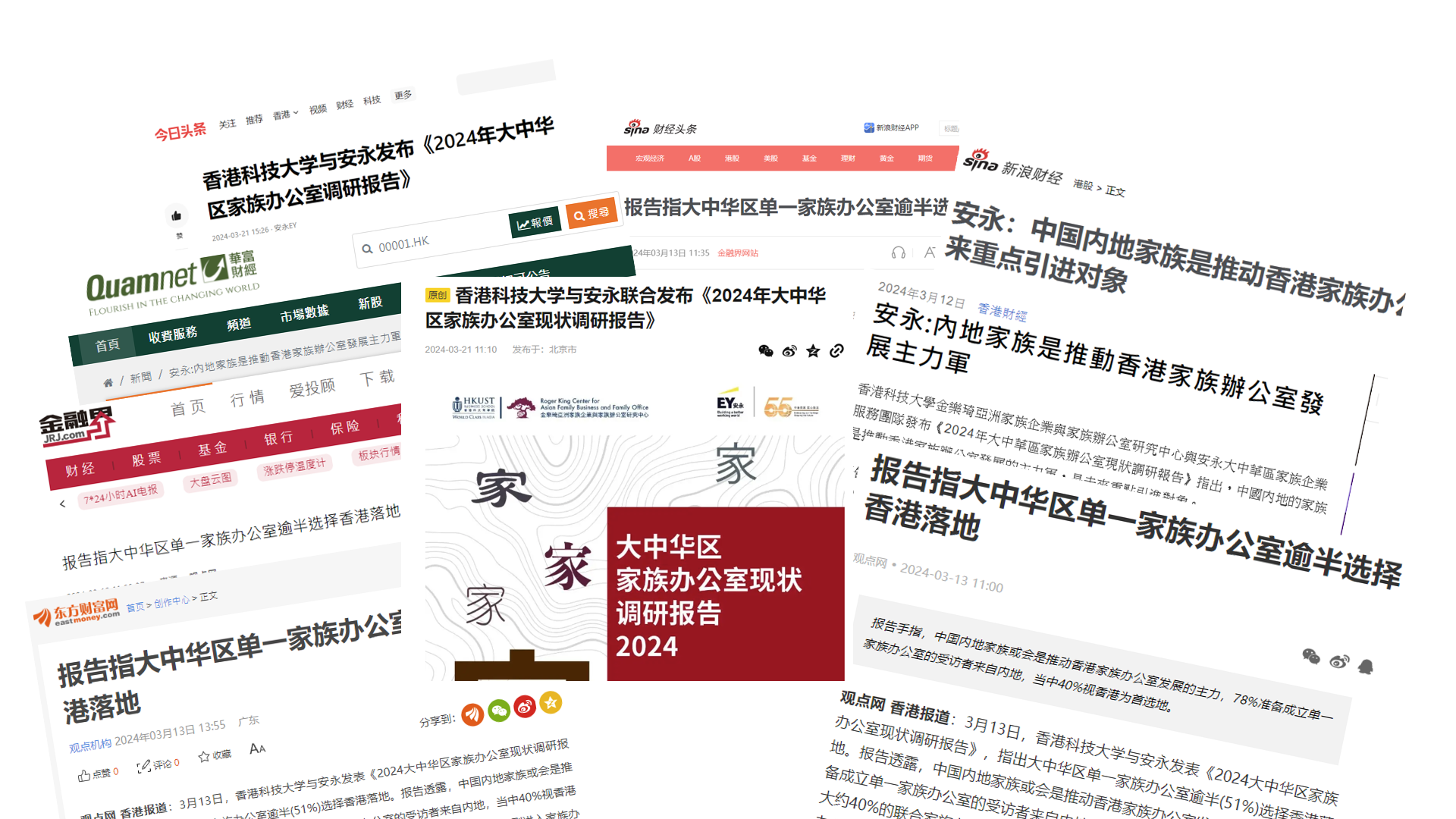 Various media reported that the Roger King Center for Asian Family Business and Family Office has collaborated with Ernst & Young's family business service team to publish a research report on family offices in Greater China. The report highlighted that families from mainland China have emerged as a significant catalyst for the growth of family offices in HK.
