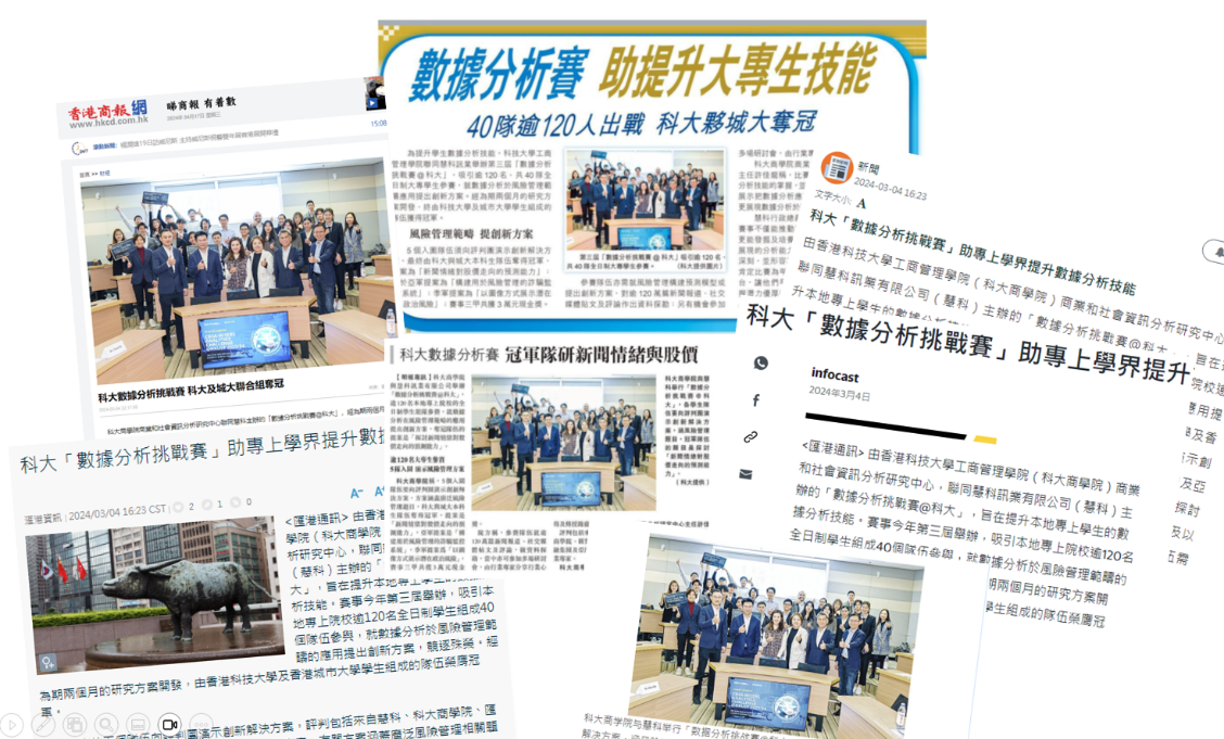 Various media, including HK Economic Times, HK Economic Times (2), mingshengbao, mingpaocanada, Ming Pao (1), Ming Pao (2), hkcd.com, aastock, quamnet, ynews and infocastfn.com, reported that HKUST Business School and Wisers held a data analysis challenge, with 120 students from local tertiary institutions forming 40 teams to compete. Senior Assoc. Dean Prof. HUI Kai-Lung said that the competition could help tertiary students master data analysis skills and use them in the real world.