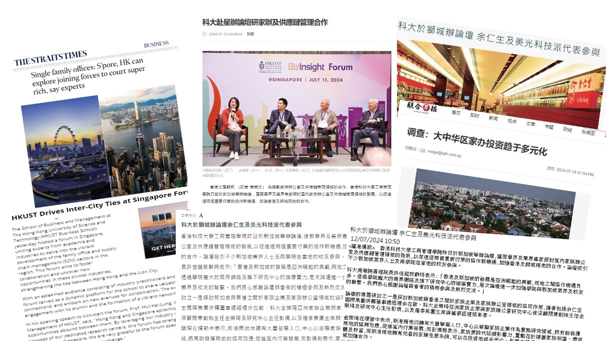Various media, including Wen Wei Po, Mirage News, aastocks, infocastfn.com, and quamnet, reported that the School hosted a forum in Singapore, uniting experts from academia and industries to delve into the vibrant development of the family office and supply chain management sectors in the region. Acting Dean Prof. HUI Kai-Lung pointed out that by leveraging the school’s industry connections and intellectual prowess, this forum has strengthened ties with school alumni and the industry in Singapore.
