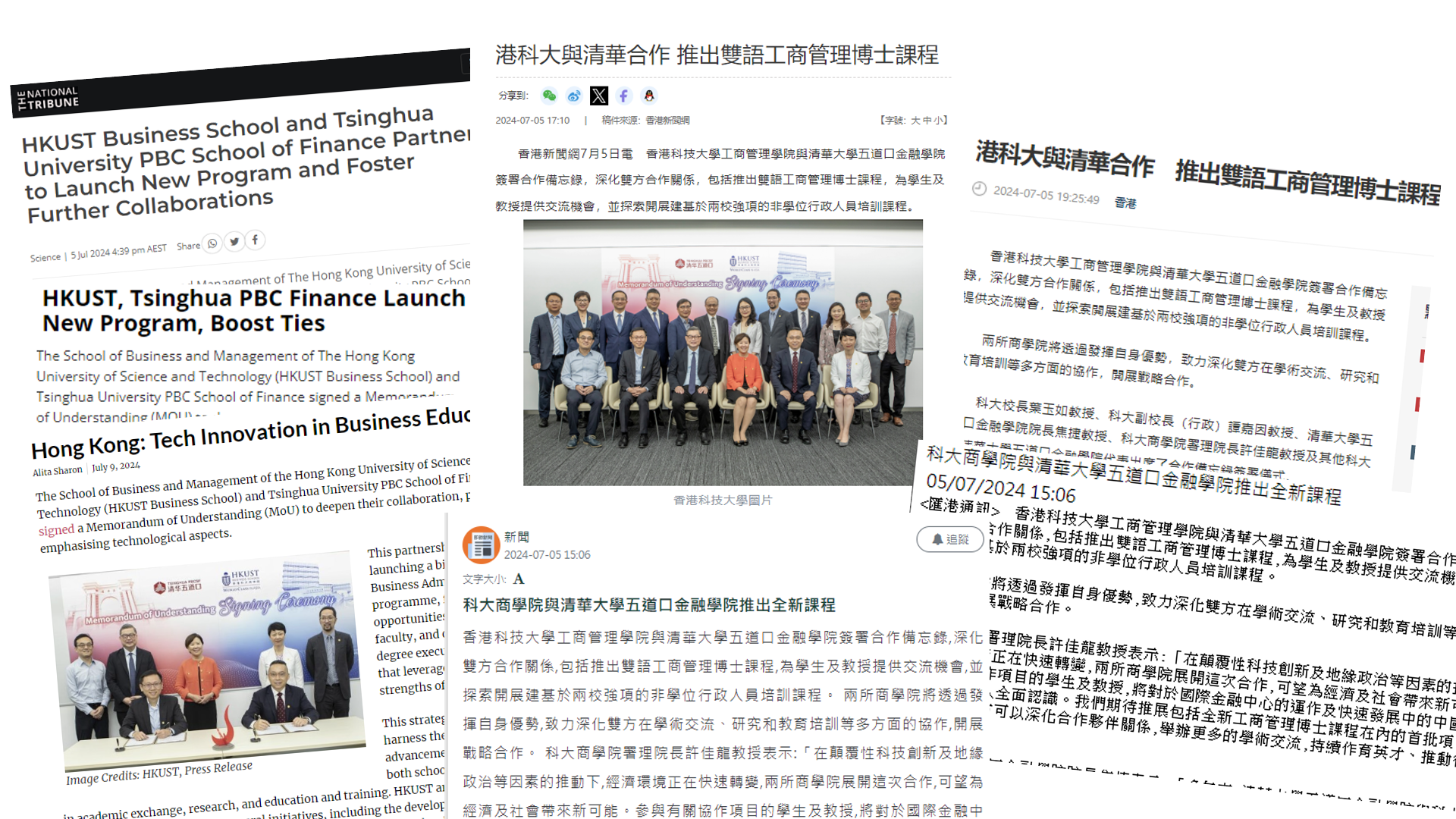 Various media, including National Tribune, Mirage News, OpenGov Asia, wenweipo, hkcna.hk, quamnet, and Infocastfn reported that the School and Tsinghua University PBC School of Finance signed an MoU to deepen collaboration, including launching a bilingual Doctor of Business Administration program, and fostering exchange opportunities for students and faculty. HKUST President Prof. Nancy IP, VPAB Prof. TAM Kar-Yan, Acting Dean Prof. Hui Kai-Lung, Dean of Tsinghua University PBC School of Finance Prof. JIAO Jie, and other representatives from both universities attended the signing ceremony.