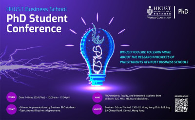 HKUST Business School PhD Student Conference 2024年5月14日 (星期二) 10:00am -5:00pm Business School Central, 1501-02, Hong Kong Club Building, 3A Chater Road, Central, Hong Kong 校外