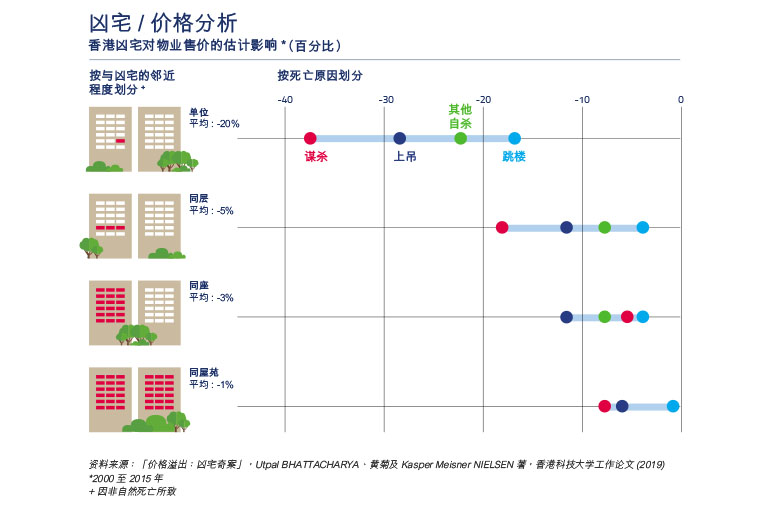 谋杀事件对单位价格的负面影响最大,如屋内发生谋杀,价格下跌34.5%。谋杀事件对邻近单位价格的负面影响亦为最大,受影响楼层的单位价格下跌19.2%,受影响的同座单位价格下跌10.2%,而受影响屋苑的单位价格下跌4.7%。