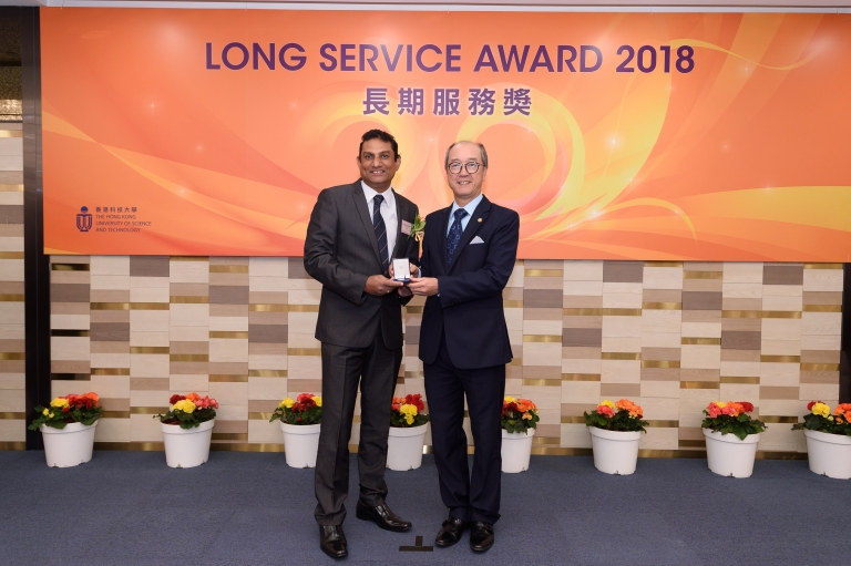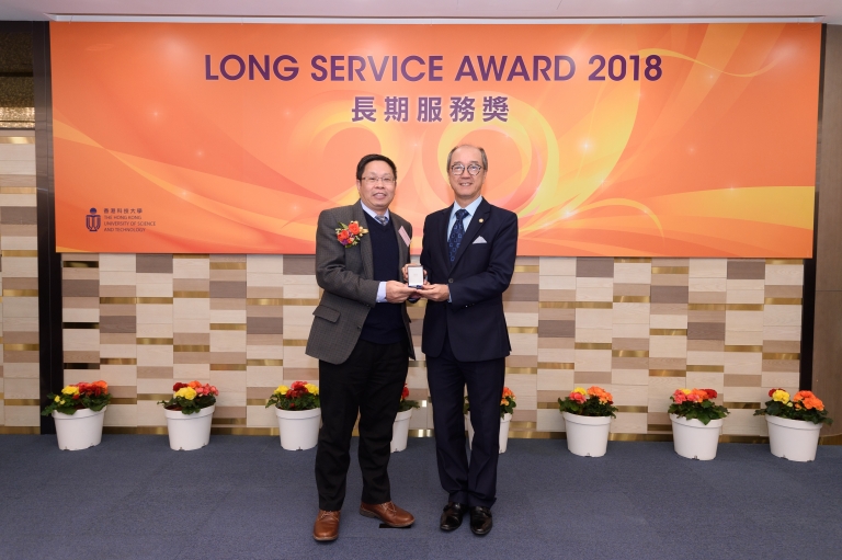 Associate Prof Peter Chen, Department of Accounting, and Associate Prof Garvin Percy Dias, Department of Information Systems, Business Statistics and Operations Management, were presented with the HKUST Long Service Awards on 29 January 2018.