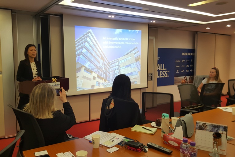 On March 14, Prof Emily NASON, Associate Dean (Undergraduate Student Affairs) and Ms Sophia WAN, Assistant Director of UG Student Development and Career Services, were invited by InvestHK and the AmCham Apparel and Footwear Committee to join their monthly meeting at the Academy International Limited. They gave a presentation on how the HKUST Business School prepares its undergraduate students for their future career development through innovative curriculum and application-based learning, and the employer services we provide.