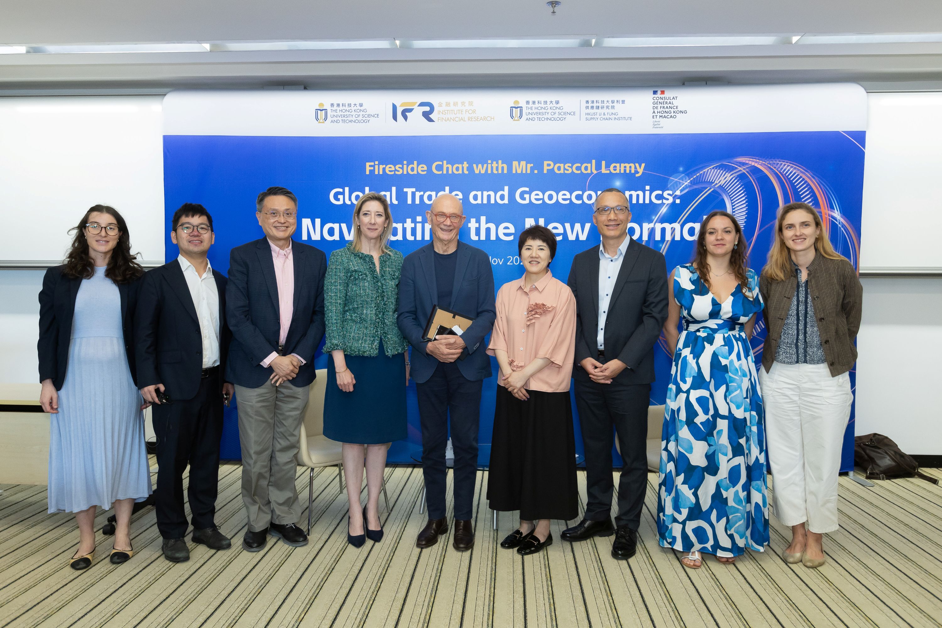 世貿組織前總幹事帕斯卡爾·拉米先生(中);科大助理副校長(環球事務)吳麗萍博士(右四);法國駐香港及澳門總領事杜麗緹女士(左四);香港科技大學利豐供應鏈研究院院長黎擎教授(右三);科大金融研究院助理院長唐博博士(左二);法國-香港科技大學創新科技中樞園主任楊經倫教授(左三);以及其他法國駐港澳總領事館代表合照。