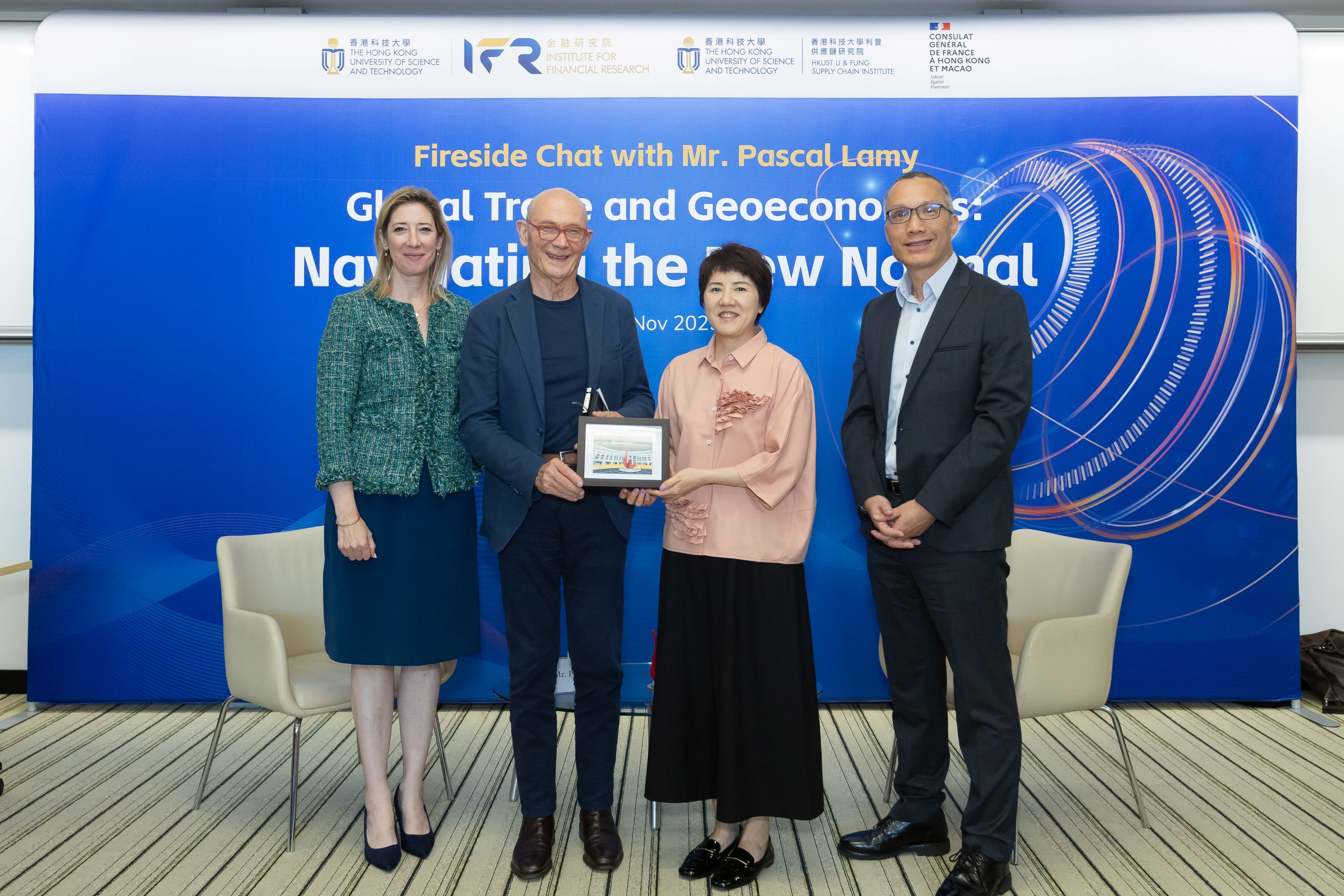 科大助理副校長(環球事務)吳麗萍博士(右中) 致送紀念品予世貿組織前總幹事帕斯卡爾·拉米先生(左中),感謝其於活動中的精彩分享,旁為法國駐香港及澳門總領事杜麗緹女士(左一) 及香港科技大學利豐供應鏈研究院院長黎擎教授(右一)。
